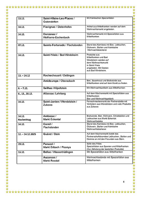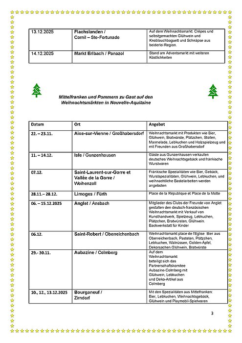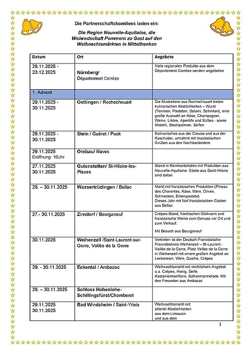 ANSBACH – Gemeinden aus der französischen Region Nouvelle-Aquitaine und der polnischen Woiwodschaft Pommern beteiligen sich im Rahmen der bestehenden Regionalpartnerschaften mit dem Bezirk Mittelfranken an verschiedenen Weihnachtsmärkten in der Region. Zwischen dem 27. November und dem 14. Dezember wirken Gemeinden aus den Partnerregionen des Bezirks aktiv an insgesamt 23 Weihnachtsmärkten in Mittelfranken mit, unter anderem in Bad Windsheim, Wassertrüdingen, Zirndorf, Gunzenhausen, Eckental und Wendelstein. Am Nürnberger Christkindlesmarkt ist das Département Corrèze selbst vertreten.