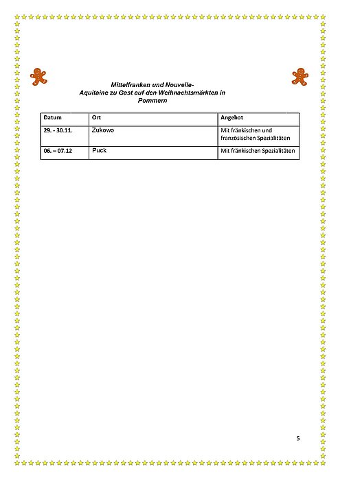 Doch auch in die Gegenrichtung wird überregional zusammengearbeitet. So beteiligen sich ebenfalls 23 mittelfränkische Kommunen an Weihnachtsmärkten in Nouvelle-Aquitaine. Es reisen unter anderem Mitglieder des Clubs der Freunde von Anglet aus Ansbach vom 6. bis 15. Dezember in die französische Partnerstadt, wo sie den deutsch-französischen Weihnachtsmarkt mit einer Backwerkstatt für Kinder und dem Verkauf von Kunsthandwerk, Spielzeug, Lebkuchen, Plätzchen, Bratwürsten und Glühwein gestalten. Zudem werden auf den Weihnachtsmärkten in Zukowo und Puck im polnischen Pommern fränkische Spezialitäten angeboten.