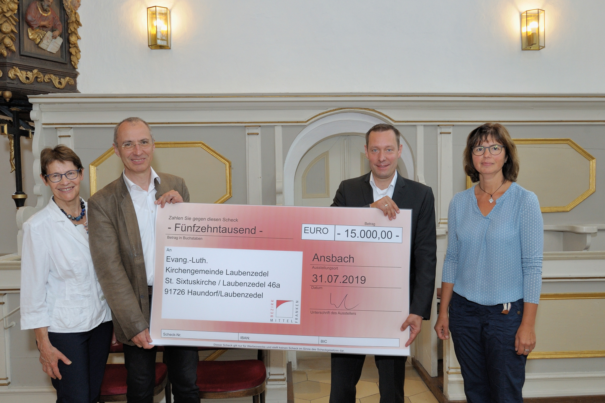 Gunzenhausen – Der Bezirk Mittelfranken fördert die Sanierung der Pfarrkirche St. Sixtus in Laubenzedel, einem Ortsteil von Gunzenhausen, mit 15.000 Euro. Bezirkstagspräsident Armin Kroder hat am Mittwoch, den 31. Juli 2019 in der Kirche einen symbolischen Scheck in entsprechender Höhe an Pfarrer Dr. Jürgen Stadler übergeben. Die Saalkirche war im August 2017, nach einer zweijährigen umfassenden Sanierung wiedergeweiht worden.