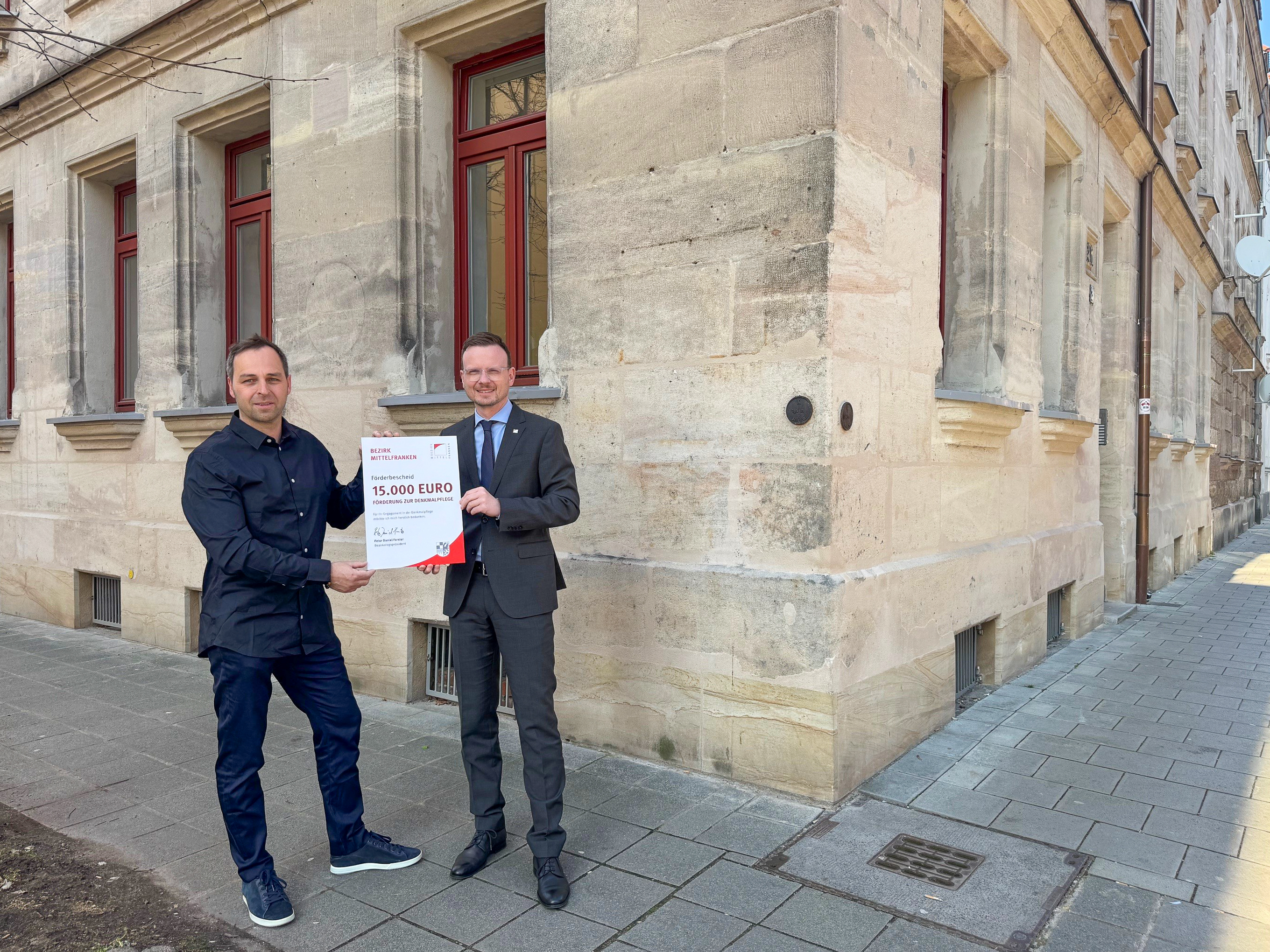NÜRNBERG – Bezirkstagspräsident Peter Daniel Forster überreichte am gestrigen Donnerstag einen Förderbescheid über 15.000 Euro an die built good 0601 GmbH, vertreten durch ihren Geschäftsführer Roman Gabriel. Das Unternehmen sanierte zwischen September 2022 und November 2023 „das Mendel“ in der Nürnberger Mendelstraße 26, das das Ensemble Vorstadt Gostenhof maßgeblich prägt. Das 1899 erbaute Eckhaus mit Sandsteinfassade ist aufgeteilt in zwei Vollgeschosse, zwei Dachgeschosse und einen Keller. Bei der Gesamtsanierung wurde das Erscheinungsbild der Gebäudehülle bewahrt. Die Kosten der Maßnahme beliefen sich auf rund 1,85 Mio. Euro. Der Anteil für denkmalpflegerischen Mehraufwand an den Gesamtkosten beträgt in etwa 155.000 Euro.