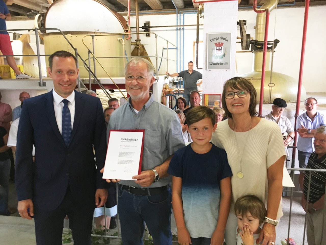 Foto von links: Bezirkstagspräsident Armin Kroder, Siegfried Brückler, Ruth Brückler mit zwei Enkelkindern der beiden. Quelle: Wolf Dieter Enser, Bezirk Mittelfranken.