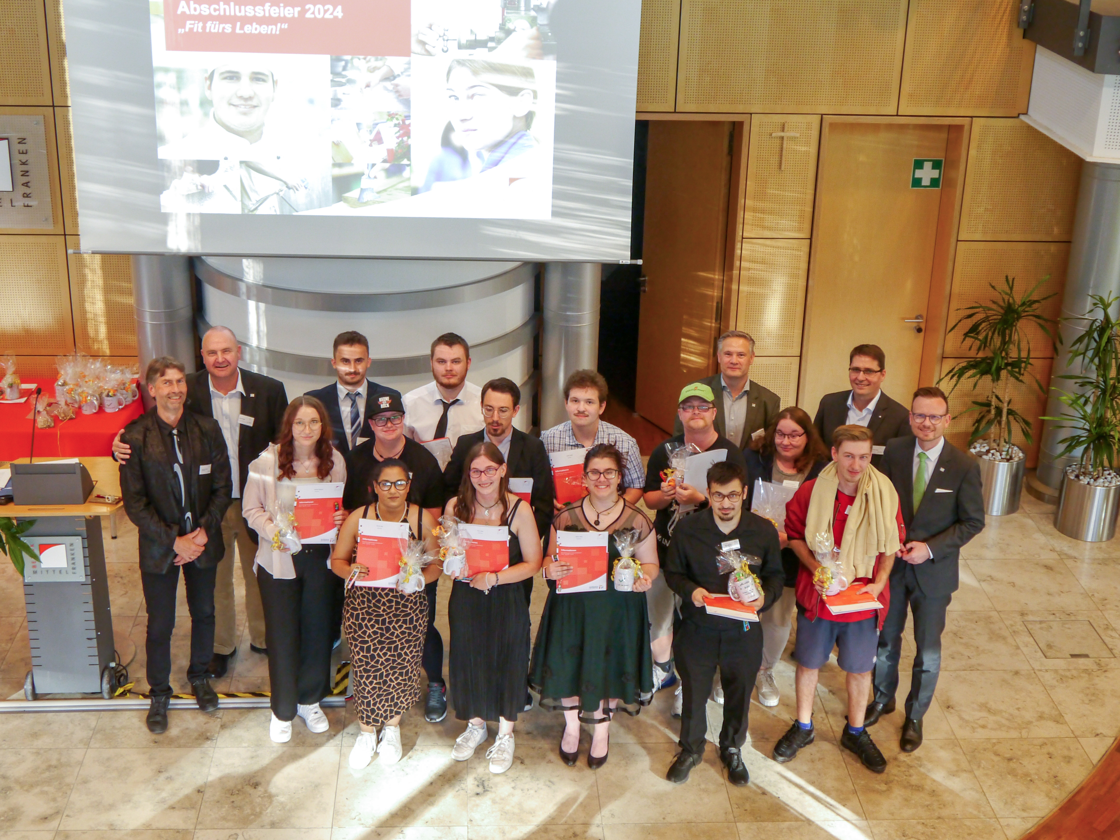 ANSBACH – 15 angehende Fachkräfte aus den Berufsfeldern Holztechnik, Ernährung und Hauswirtschaft, Metalltechnik sowie Wirtschaft und Ver-waltung/Lager an der Außenstelle Ansbach des Berufsbildungswerkes des Bezirks Mittelfranken Hören, Sprache, Lernen (BBW HSL) haben bereits ihre Abschlussprüfung bestanden oder werden diese bis Ende Juli ablegen. Eine sozialversicherungspflichtige Beschäftigung im Anschluss haben schon zehn von ihnen erhalten. Im Rahmen der Nachbetreuung werden die noch Arbeitssuchenden in ihren Integrationsbemühungen weiterhin unterstützt und begleitet. Zudem beenden am 27.07.2024 neun Teilnehmende ihre Berufsvorbereitende Bildungsmaßnahme. Sie werden anschließend eine Ausbildung oder ein weiterführendes Angebot aufnehmen. Aus den Händen von Bezirkstagspräsident Peter Daniel Forster erhielten alle am 17. Juli im Rahmen der Abschlussfeier im Bezirksrathaus ihre Ausbildungszeugnisse und Zertifikate.