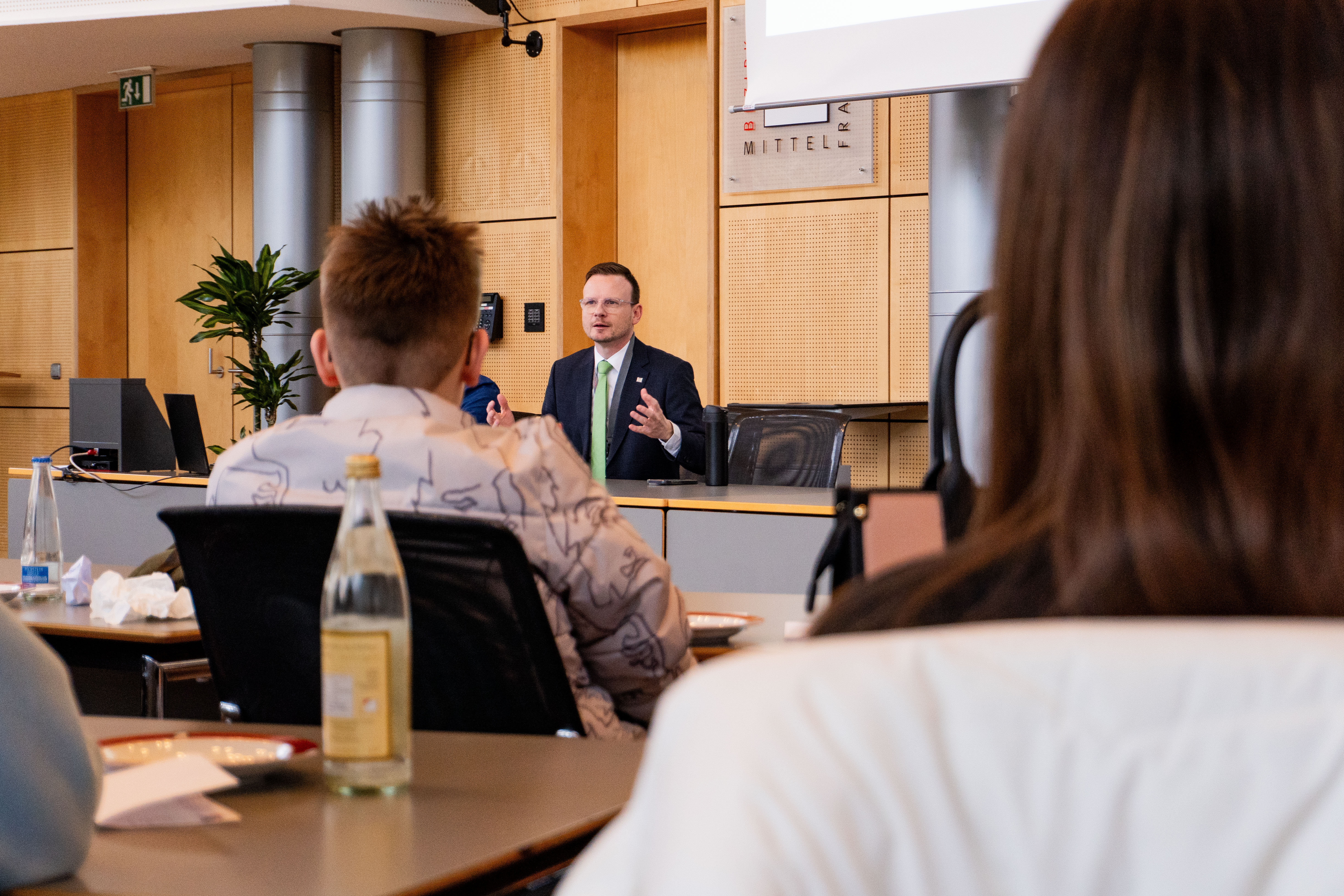Nach einem Rundgang durch das Bezirksrathaus begann der Tag für die Neuntklässler im Saal Mittelfranken mit einem Bezirksquiz und Informationen über Aufbau und Aufgaben der sieben bayerischen Bezirke, vermittelt durch Vertreter der Bayerischen Landeszentrale für politische Bildungsarbeit. Im Anschluss konnten sich die Schülerinnen und Schüler direkt mit Bezirkstagspräsident Peter Daniel Forster austauschen, der auf alle Fragen der Klasse einging und diese beantwortete. Danach wurden die vielfältigen Berufs- und Karrieremöglichkeiten beim Bezirk Mittelfranken vorgestellt. Zum Abschluss des Schultages gab es noch eine Führung über das angrenzende Gelände des Bezirksklinikums Ansbach durch den kaufmännischen Leiter Benjamin Fischer. Dabei wurde auch das hauseigene Museum besucht, welches für die Schülerinnen und Schüler einen weiteren Höhepunkt des Tages darstellte.