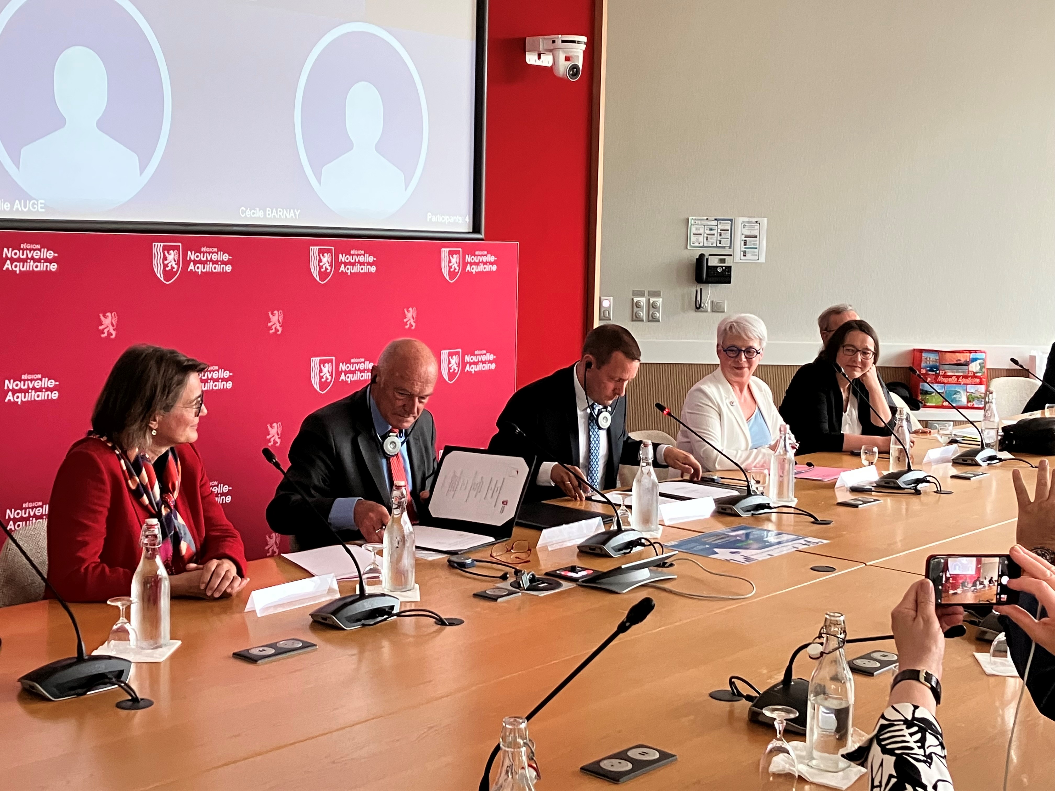 Ansbach/Bordeaux – „Russlands Angriffskrieg auf die Ukraine zeigt einmal mehr, wie wichtig ein friedliches und geeintes Europa ist. Starke und tragende Säulen dafür sind Partnerschaften zwischen Kommunen und Regionen“, betonte der mittelfränkische Bezirkstagspräsident Armin Kroder beim jüngsten Besuch in der Region Nouvelle-Aquitaine. Im Zeichen der deutsch-französischen Freundschaft unternahmen er, die Beauftragte für die Regionalpartnerschaften mit der Region Nouvelle-Aquitaine und den drei Départements Haute-Vienne, Creuse und Corrèze, Maria Scherrers, die Vorsitzende des Ausschusses für Jugend-, Sport- und Regionalpartnerschaften, Alexandra Wunderlich, sowie weitere Mitglieder des Bezirkstages vergangene Woche eine Fahrt in die französische Region. Höhepunkt des viertägigen Besuchs war die Unterzeichnung der offiziellen Partnerschaftsurkunde zwischen dem Bezirk und der 2017 durch eine Gebietsreform entstandenen Großregion. Bezirkstagspräsident Kroder und sein französischer Amtskollege Alain Rousset unterschrieben das Dokument im Verwaltungssitz der Region in der Hauptstadt Bordeaux. Bewegende Momente erlebte die mittelfränkische Delegation bei den Gedenkfeiern in Tulle aus Anlass des dort 1944 von der Waffen-SS begangenen Massakers und in Oradour-sur-Glane, wo Mitglieder der Waffen-SS 642 Bewohner des Ortes töteten.