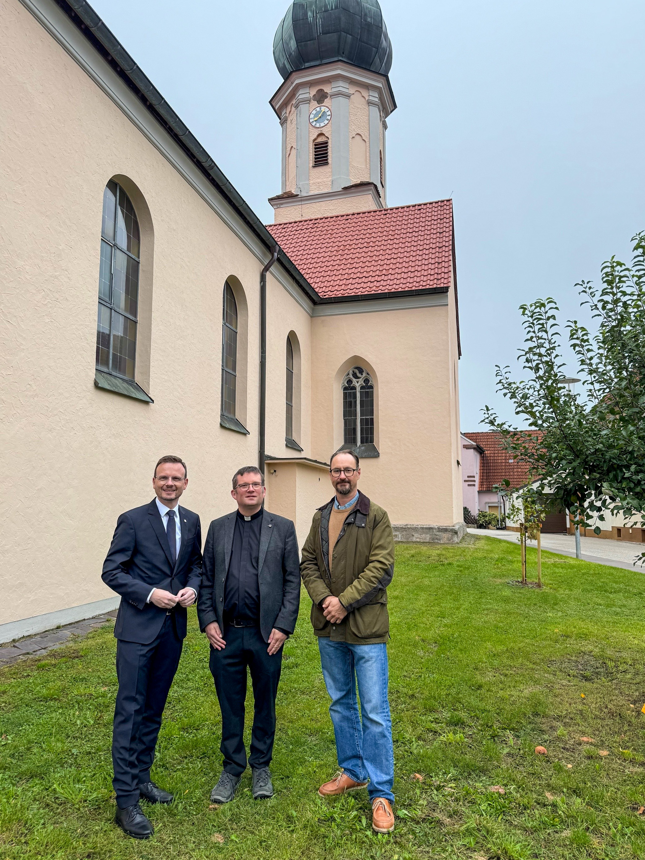 BURGOBERBACH – Bezirkstagspräsident Peter Daniel Forster überreichte kürzlich einen Förderbescheid zur Förderung der Denkmalpflege über 15.000 Euro an die Katholische Pfarrkirchenstiftung Burgoberbach, vertreten durch Pfarrer Laurent Koch und Kirchenpfleger Michael Alban. Im Februar 2021 musste die Pfarrkirche St. Nikolaus wegen akuter Einsturzgefahr vorübergehend geschlossen werden.