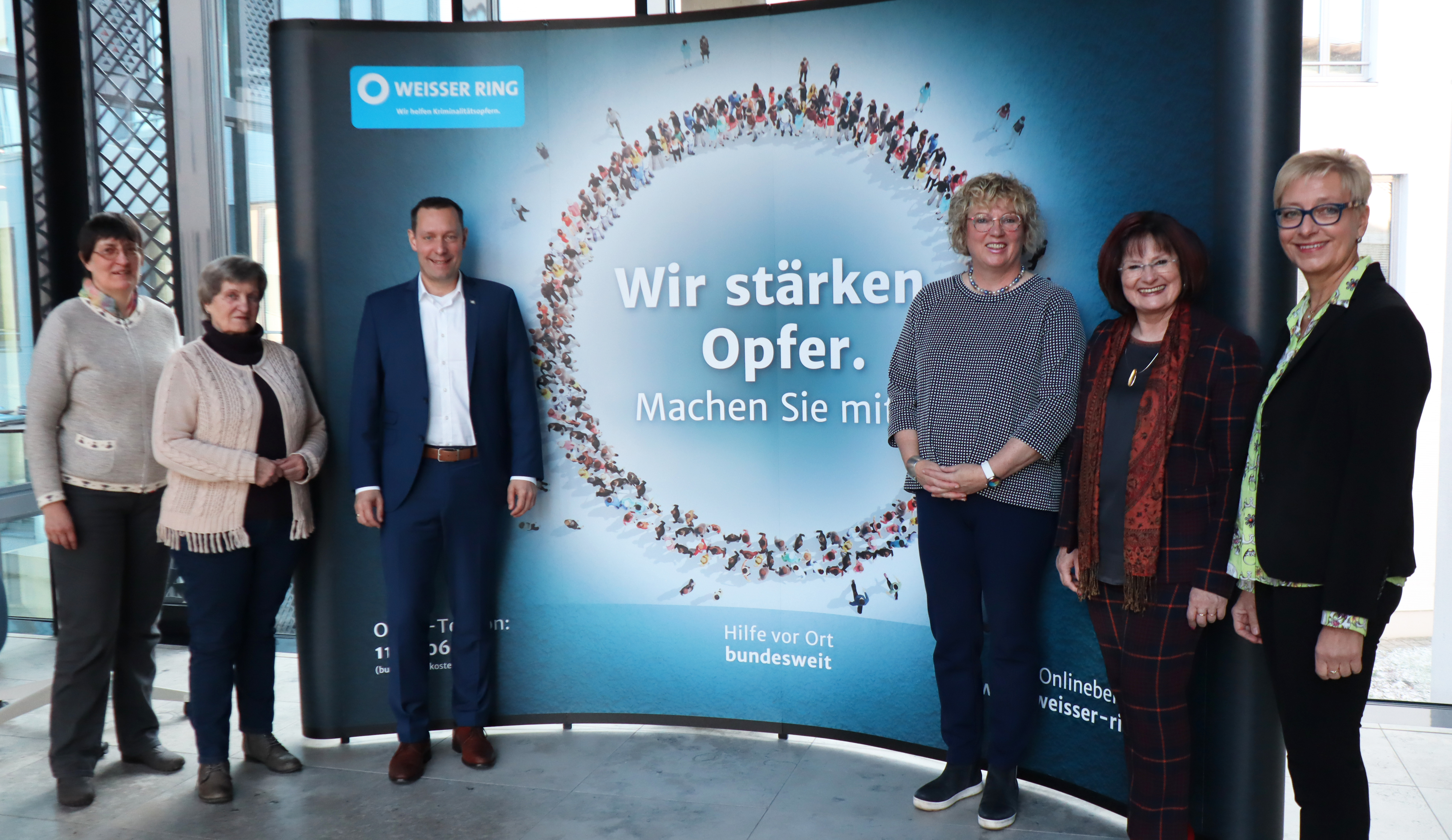 Das persönliche Schicksal, nämlich ein Einbruch in ihr eigenes Haus, war es, das Claudia Geißler-Kraft dazu bewog, beim WR als Ehrenamtliche mitzuarbeiten. „Ich dachte mir, das ist ein Signal, da muss etwas Gutes daraus entstehen.“ Seit gut vier Jahren ist sie bei der Ansbacher Außenstelle nun für die Öffentlichkeitsarbeit zuständig. Dabei liegt ihr Augenmerk darauf, „die Informationen in die Bevölkerung zu tragen.“ Exponierte Orte wie das Bezirksrathaus, Landratsamt, Stadtbücherei oder ein Gerichtsgebäude seien dafür bestens geeignet. „Unser Ziel ist es, mit den Menschen ins Gespräch zu kommen“, so Claudia Geißler-Kraft. Zunehmend schwerer werde die Vermittlung der Opfer an Fachstellen, oft gebe es wochenlange Wartezeiten. „Hier ist der Bezirk Mittelfranken löblich, was die Kostenübernahme der Beratungsstellen anbelangt“, so Claudia Geißler-Kraft. Der Bezirk finanziert die Kontakt- und Informationsstelle Selbsthilfegruppen Mittelfranken (KISS Mittelfranken), die Sozialpsychiatrischen Dienste und den Krisendienst Mittelfranken. Zum Hilfenetz zählen auch die Bezirkskliniken. „Das sind Anlaufstellen, zu denen wir die Leute hinschicken. Da kriegt man relativ schnell einen Platz“, so Claudia Geißler-Kraft. Dass die Öffentlichkeit nach einer Straftat meist nur auf das Geschehen und die Persönlichkeit der Täter schaue, darauf wies Bezirkstagspräsident Armin Kroder hin. Im eigenen Bekanntenkreis habe er erleben müssen, wie eine Familie, die Opfer eines Einbruchs wurde, mit den Folgen der Tat zu kämpfen hatte. „Einbrecher dringen in den intimsten Raum der Menschen ein. Die ehrenamtlichen Mitarbeiterinnen und Mitarbeiter des Weißen Rings leisten eine ganz wichtige Opferbegleitung und Opferhilfe“, so der Bezirkstagspräsident.