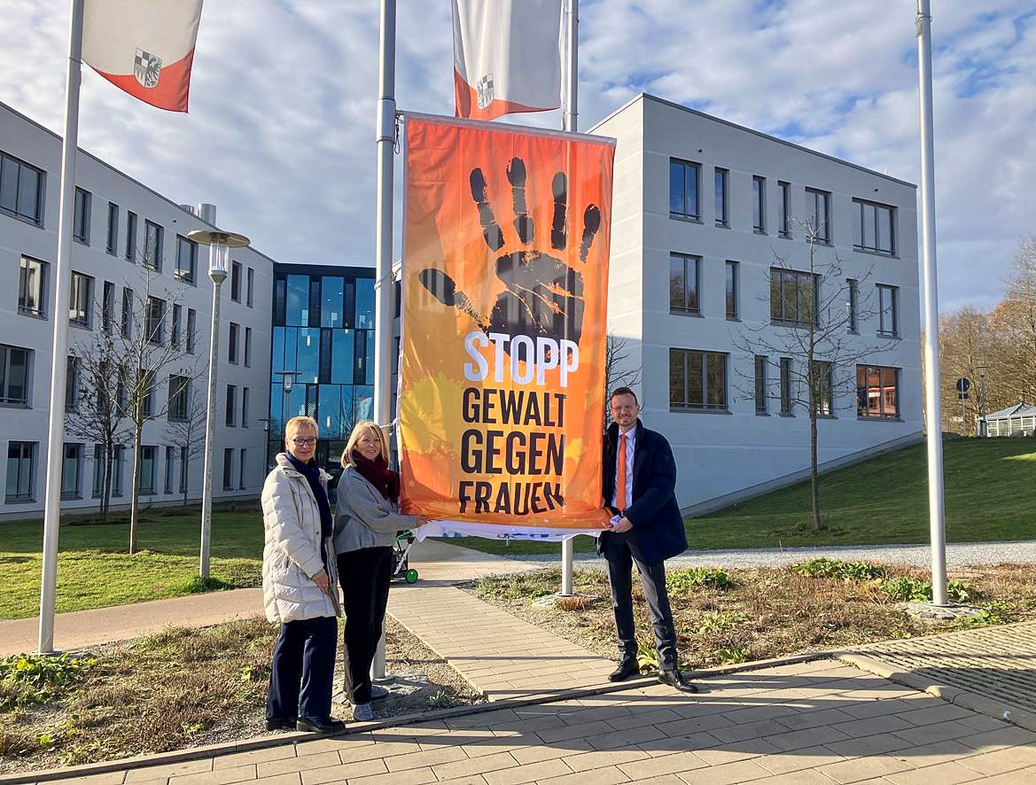 ANSBACH – Am Montag, 25. November, hisste Bezirkstagspräsident Peter Daniel Forster zusammen mit der Direktorin der Bezirksverwaltung Manuela Eppe-Sturm und mit der Gleichstellungsbeauftragten des Bezirks Mittelfranken Christina Eberlein-Pötzl vor dem Bezirksrathaus in Ansbach eine orangefarbene Flagge, um auf den sogenannten Orange Day aufmerksam zu machen.