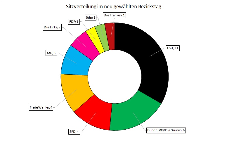 Die Linke entsendet 2 Bezirksräte, jeweils 1 Mandatsträger bzw. Mandatsträgerin gehört der FDP, der ödp sowie der Partei Die Franken an.