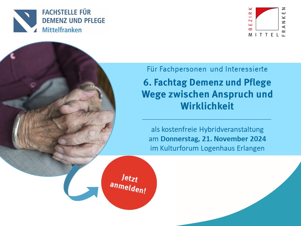 Universitätsstraße 25 in Erlangen den Spagat zwischen Anspruch und Wirklichkeit in der häuslichen Versorgung von Menschen mit Demenz. Die Veranstaltung wird von der Fachstelle für Demenz und Pflege Mittelfranken durchgeführt, die sich in Trägerschaft des Bezirks Mittelfranken befindet. Teilnehmen können Fachpersonen und Interessierte.
